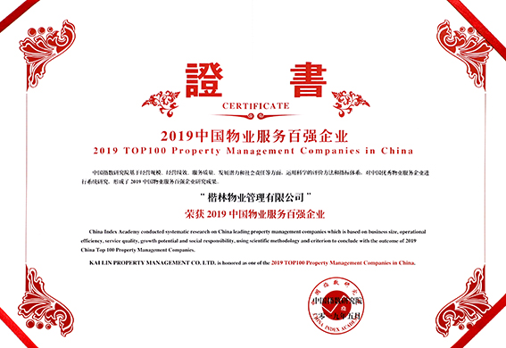 圖為榮獲2019中國物業(yè)服務(wù)百強(qiáng)企業(yè)證書